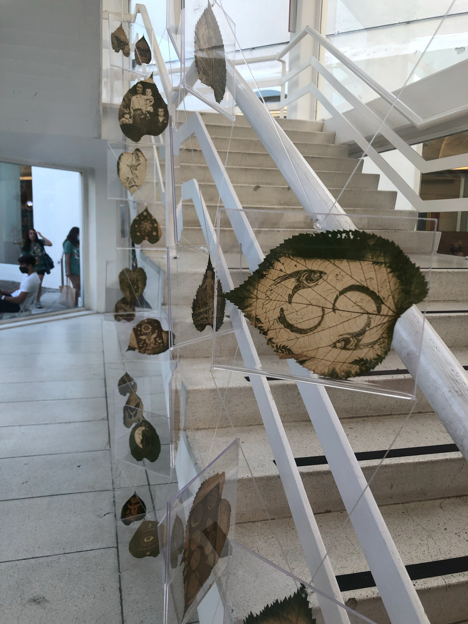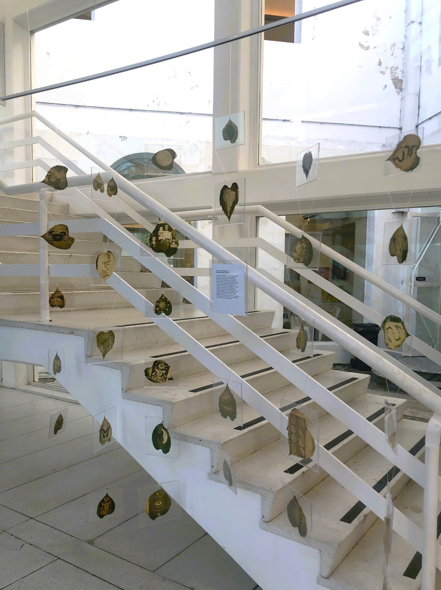 The work is composed of suspended leaves intervened through chlorophyll printing, where images are revealed by the action of sunlight on organic matter. These images refer to nature and its cycles and, as they remain exposed, they fade, shift, and change with the incidence of light.