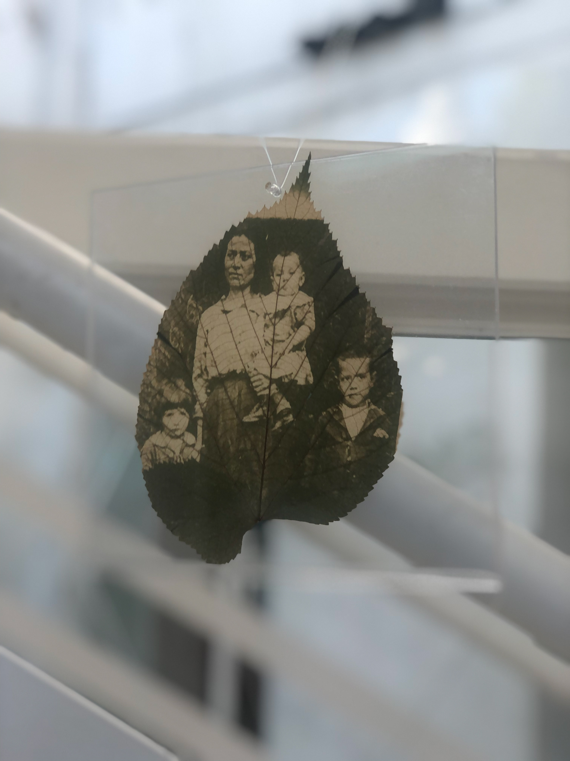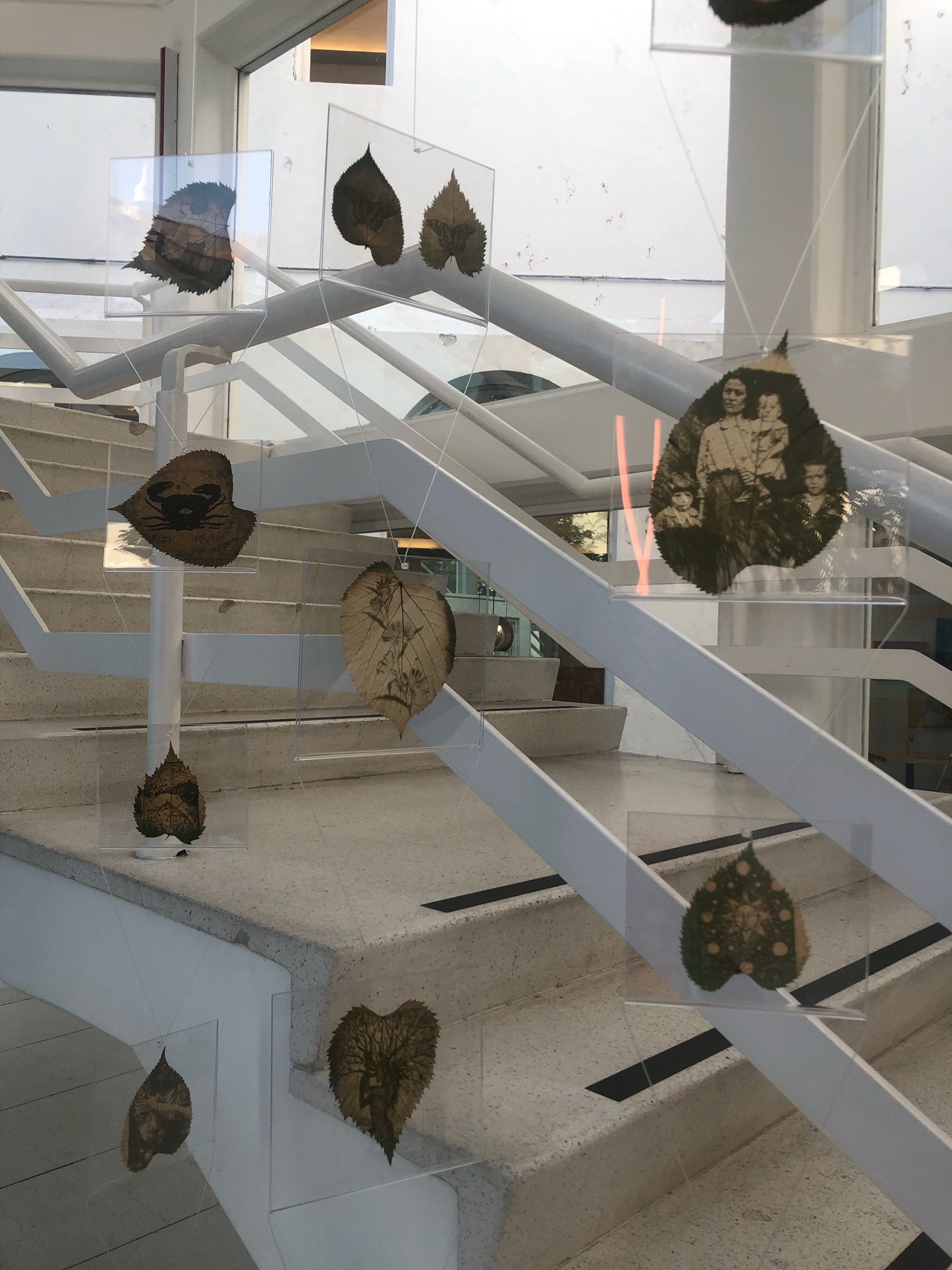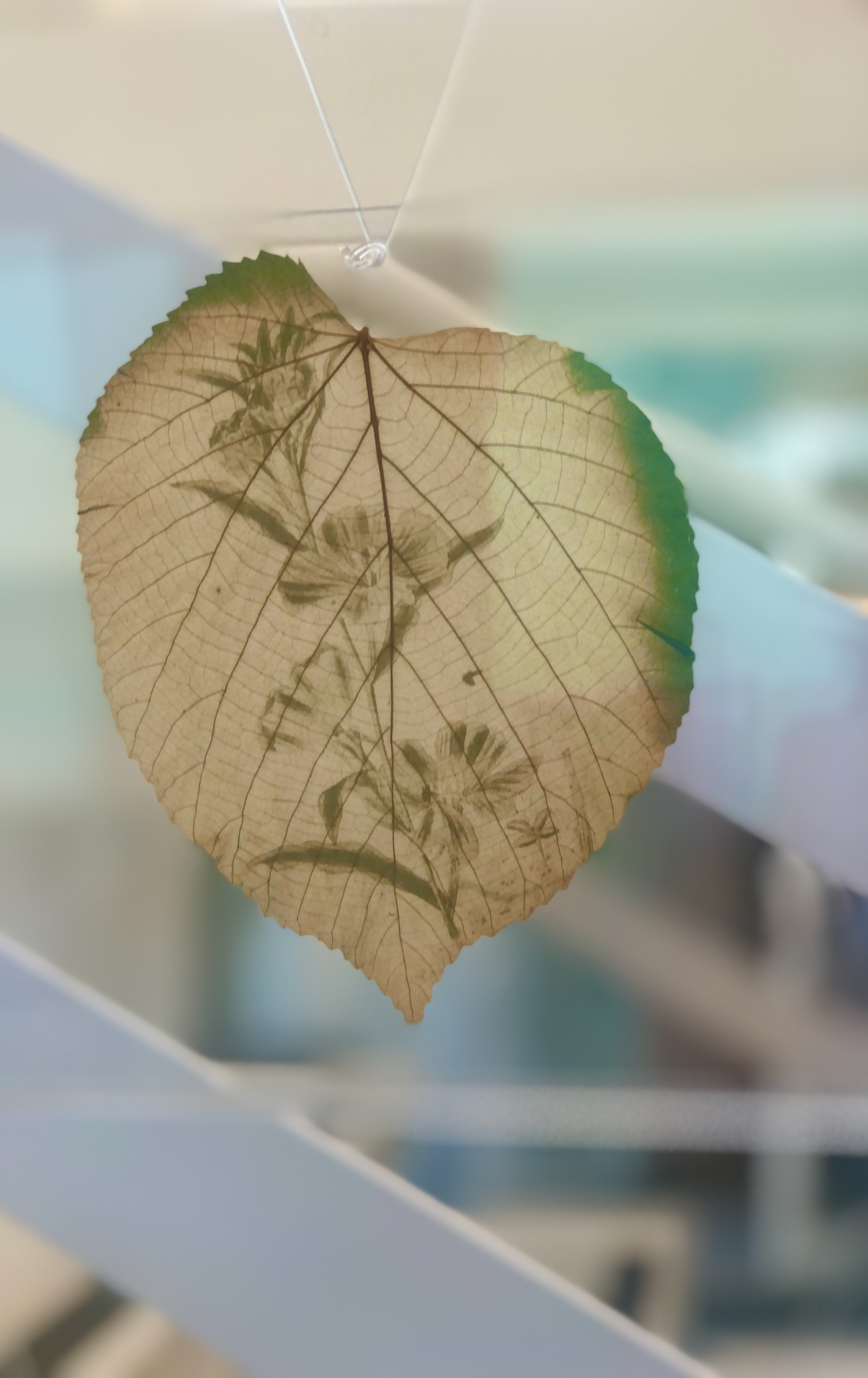 250 × 150 cm. 32 acrylic plates with leaves with chlorophyll printing, suspended with fishing line.