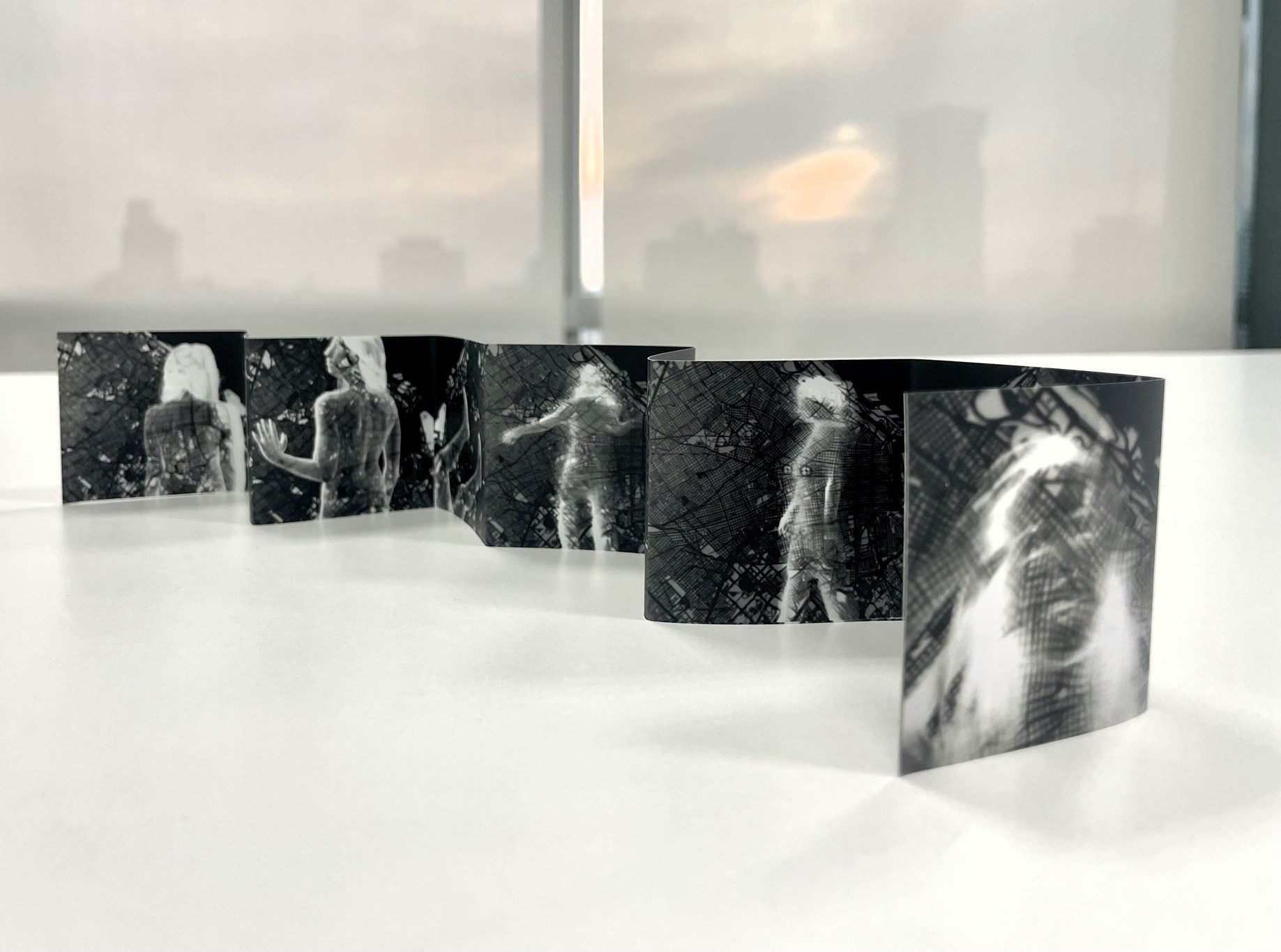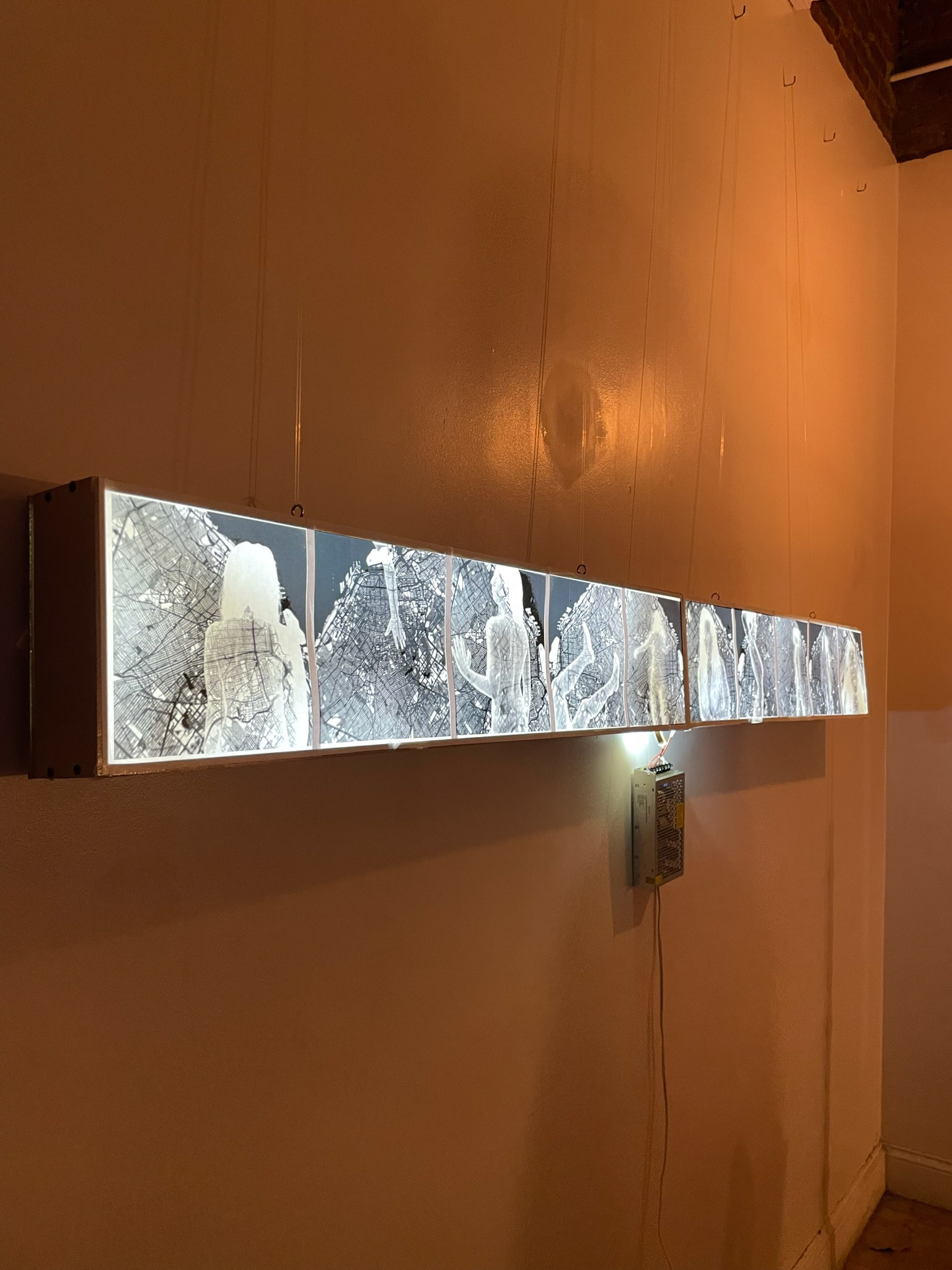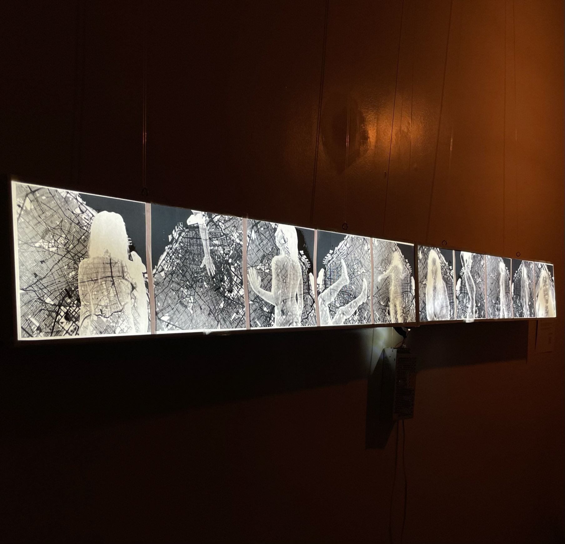 Tras realizarme varios estudios médicos, ecografías y radiografías, decidí realizar este registro compuesto por autorretratos que dialogan con mapas de la ciudad de Buenos Aires; las imágenes son llevadas al negativo, en busca de una imagen latente que podría revelarme qué es lo corría en mi interior en ese momento particular y así configurar un nuevo mapa interno.